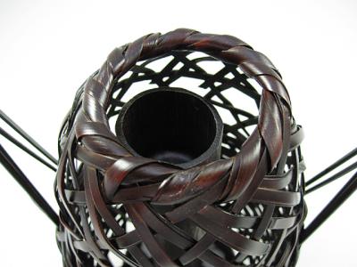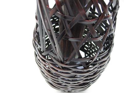 染竹の竹ヒゴで編んだ手付きの花生けです。上部は六ツ目にざっくりと編み、下部は隙間なくしっかりと編まれていてユニークな仕上がりになってます。 サイズ約径13cm×高さ22cm(口径6.5cm 持ち手までの高さ36cm)