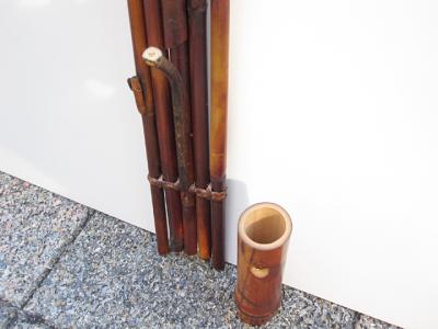 スス竹を5本連ねて風情ある捶撥です。中央に短冊、下段にお花を飾るように作ってあります。スス竹の自然素材独持の質感と風合いが、落ち着いた和の空間をより一層引き立ててくれます。 サイズ約100cm×幅7.5cm 竹筒約14cm